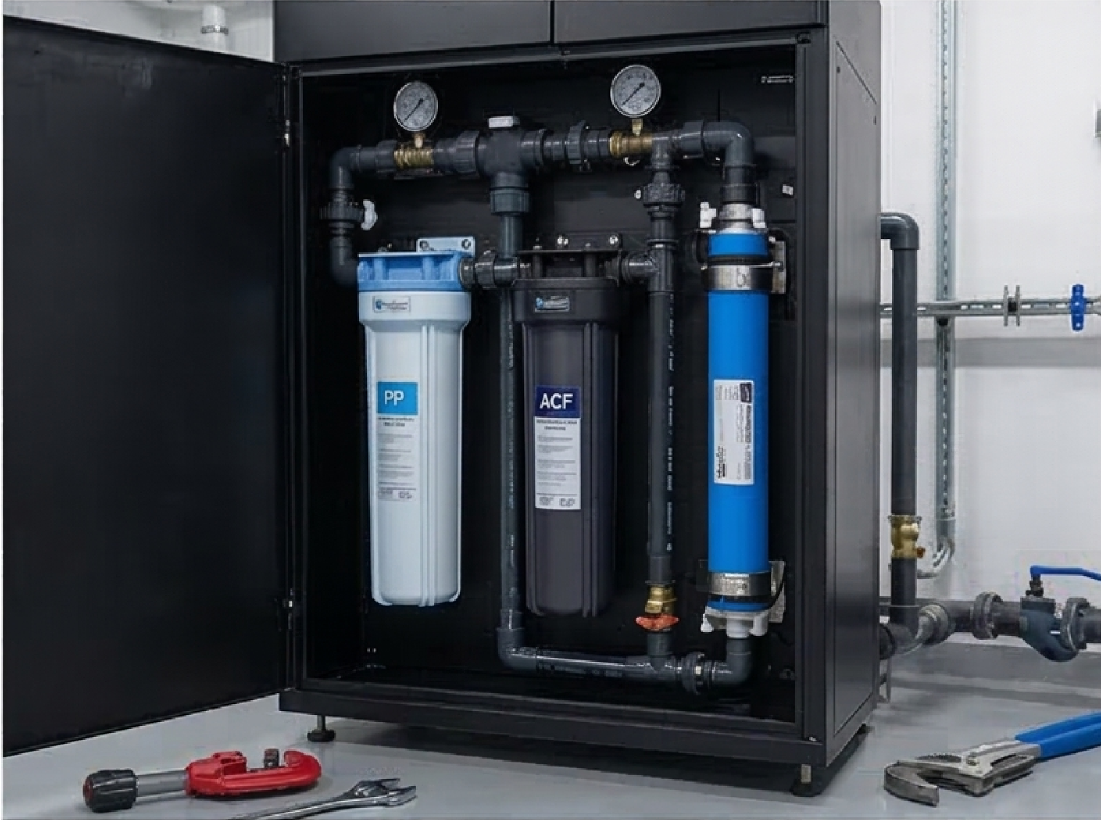 Removes heavy sediment, sand, and large particles before water enters the main system. This stage protects downstream equipment and ensures optimal filtration performance.