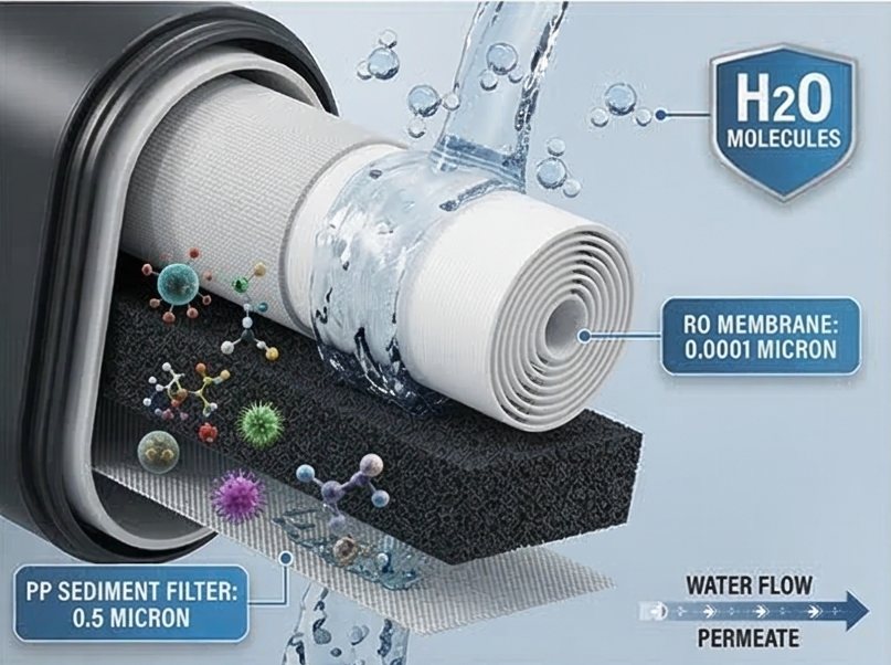 Final purification stage using multi-layer filtration and reverse osmosis membrane technology. Removes up to 99% of contaminants to deliver clean, great-tasting drinking water.